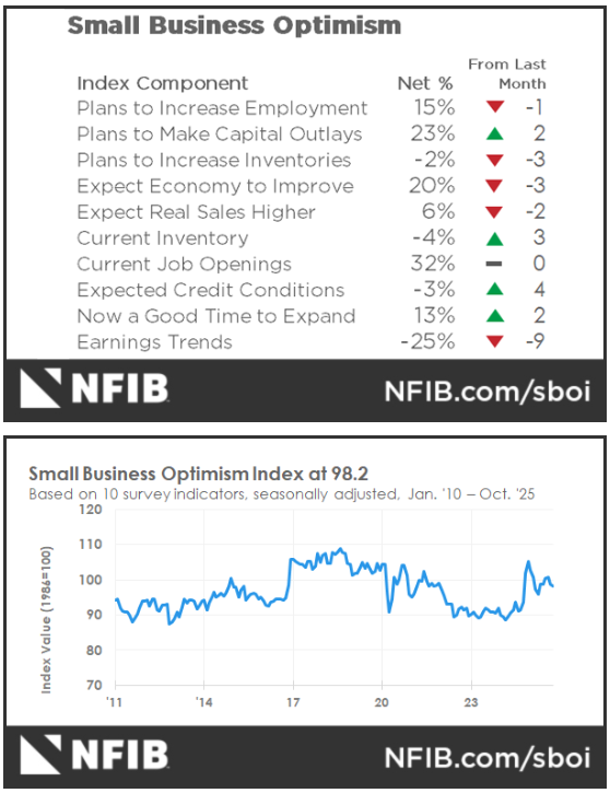 - According to the National Federation for Independent Businesses, small business optimism slipped in October but remains well above its 52-year average.