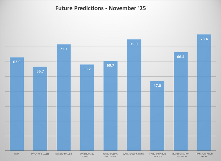 - The LMI was down 1.7 points from October to 55.7. An index level above 50 indicated expanding logistics activity. While activity remains expansionary, it has slowed significantly in recent months and is most acutely affecting warehousing activity.